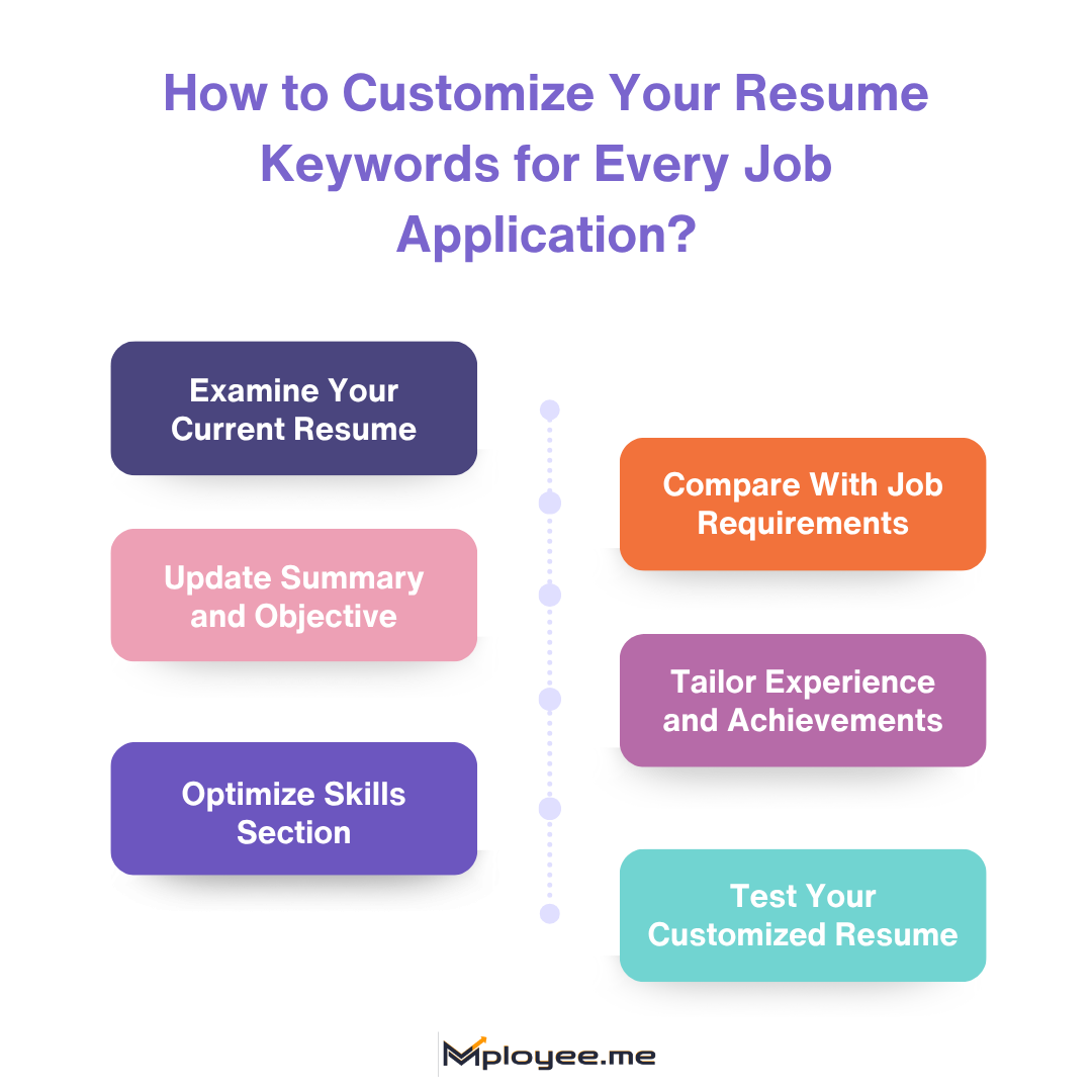 The most effective method to tailor your resume to the job is by comparing your experience with the job description keywords. Revise your summary, experience, and skills sections with suitable ATS resume keywords. Making use of tools like Resume Keywords by mployee.me or ResuScan can speed up this process and make it more precise.