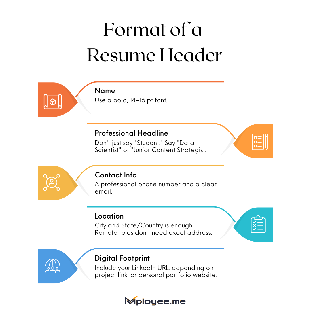 In the past, headers included home addresses and even birth dates. In 2026, your header is about accessibility. Recruiters and ATS need to know who you are through your resume and where they can see your work online instantly.