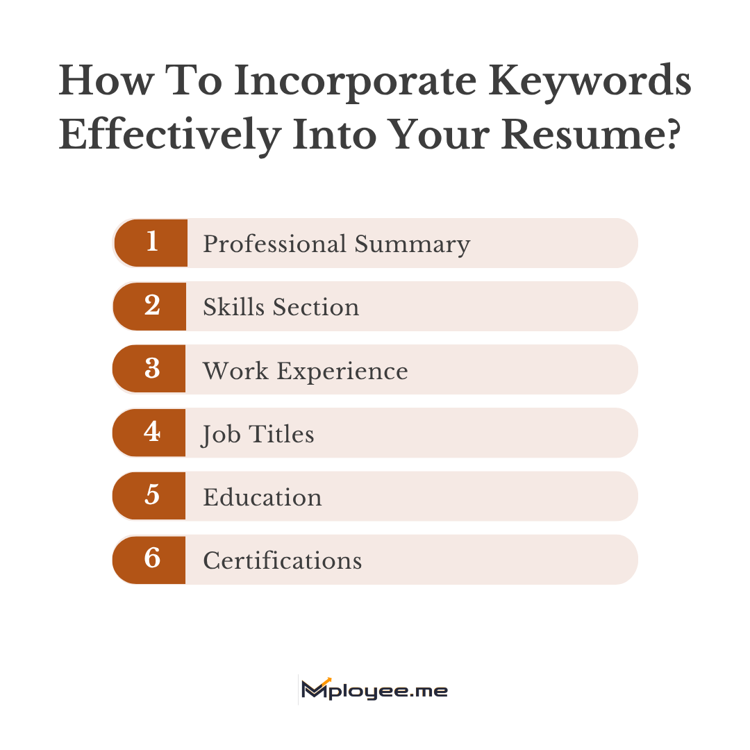 Put keywords by picking important words from the job description and adding them naturally in your summary, skills, and experience sections. Tools like Resume Keywords by mployee.me can help find the right keywords for your resume.