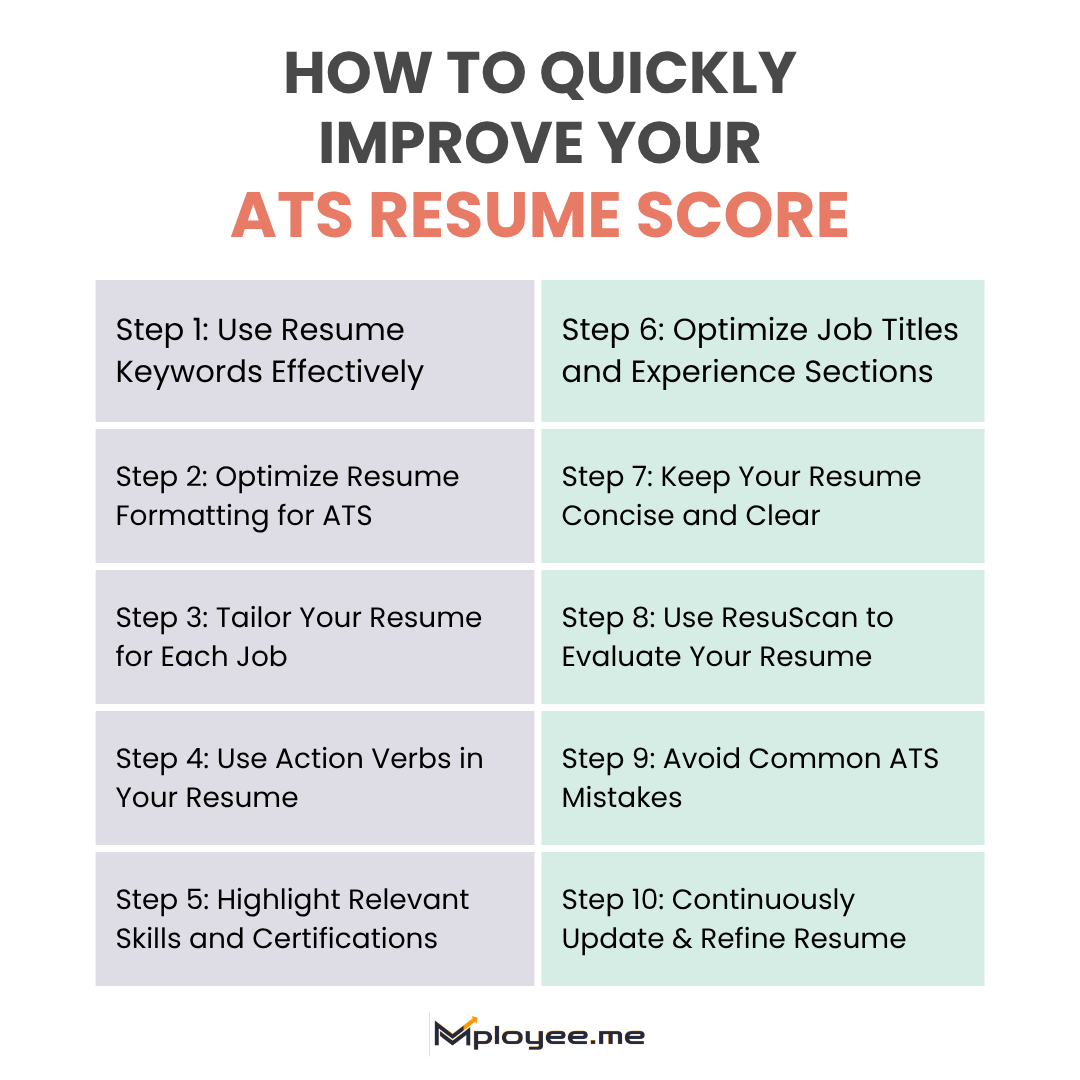 To increase your ATS resume score, it’s essential to incorporate relevant keywords found in the job description, present your resume in a simple manner using standard fonts and distinct headings and make a different one for every job application. Moreover, pinpoint main skills, professional certifications, and accomplishments along with their respective numbers, choose powerful verbs and refrain from using any graphics or intricate tables. The use of tools such as ResuScan and Resume Keywords by mployee.me will enable you to assess your resume score and also carry out proper optimization.